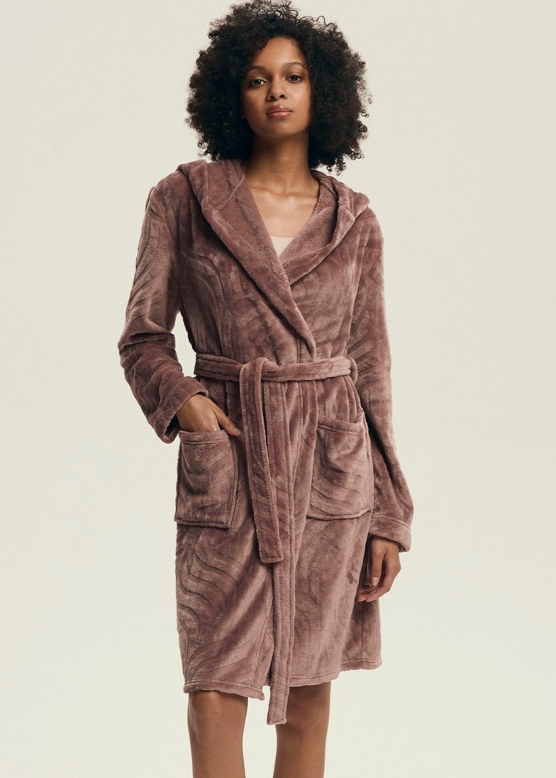 Жіночий халат з капюшоном виготовлений з м'якої, гладкої трикотажної тканини, оздоблений ніжним рельєфним візерунком. Довжина до коліна, довгі рукави та зав'язка на талії. Дві зручні зовнішні кишені. Склад: 100% поліестер.