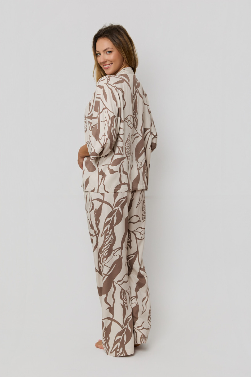 Ці стильні жіночі піжами, виготовлені з високоякісного віскозного трикотажу, – це ідеальне поєднання комфорту, легкості та елегантності. Натуральна віскоза м’яка, повітряна та делікатно охолоджує, що робить її ідеальною як для сну, так і для відпочинку вдома. Вільний світшот з V-подібним вирізом та застібкою на ґудзиках пропонує надзвичайно жіночний та сучасний вигляд. Рукава довжиною 7/8 забезпечують комфорт та легкість. Довгі штани вільного крою з практичними кишенями та еластичним поясом забезпечують повну свободу рухів та ідеальну посадку. Модний ботанічний принт доповнює образ, надаючи цій піжамі унікального характеру.