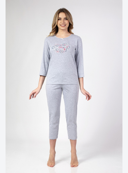 Жіноча бавовняна піжама з барвистим ніжним принтом спереду. Футболка з рукавом 3/4 і напівкруглим ви..