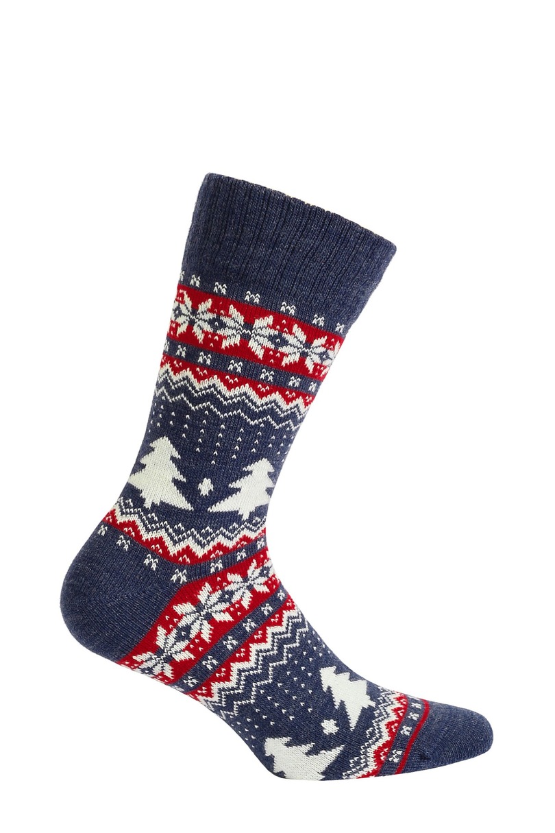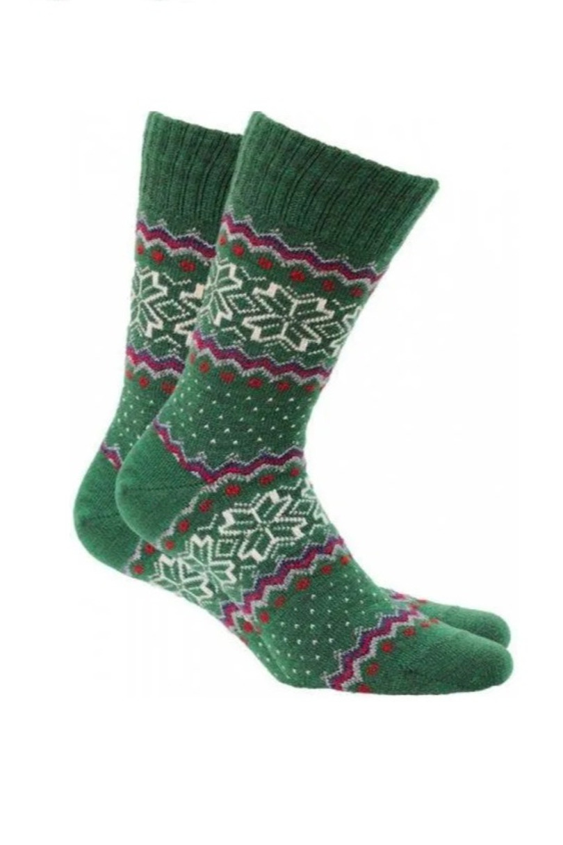 Теплі шкарпетки з малюнком з акрилу та вовни. Вони відмінно ізолюють від морозу і холоду. Приємні на дотик і в носінні, не подразнюють шкіру, амортизують стопу. Стійкість до стирання. Ідеально підходить для походів.