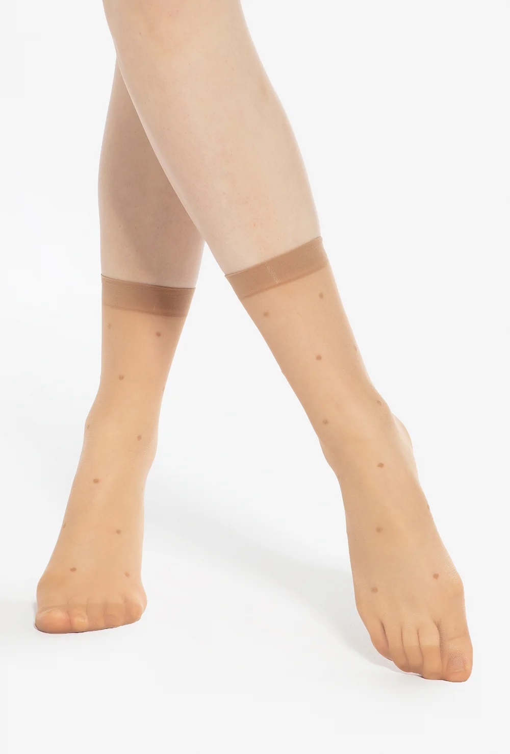 Жіночі шкарпетки з мікроретину в крапку. Ребра з ніжним воланом. Товщина 20 ден. Склад: 90% поліамід, 10% еластан.