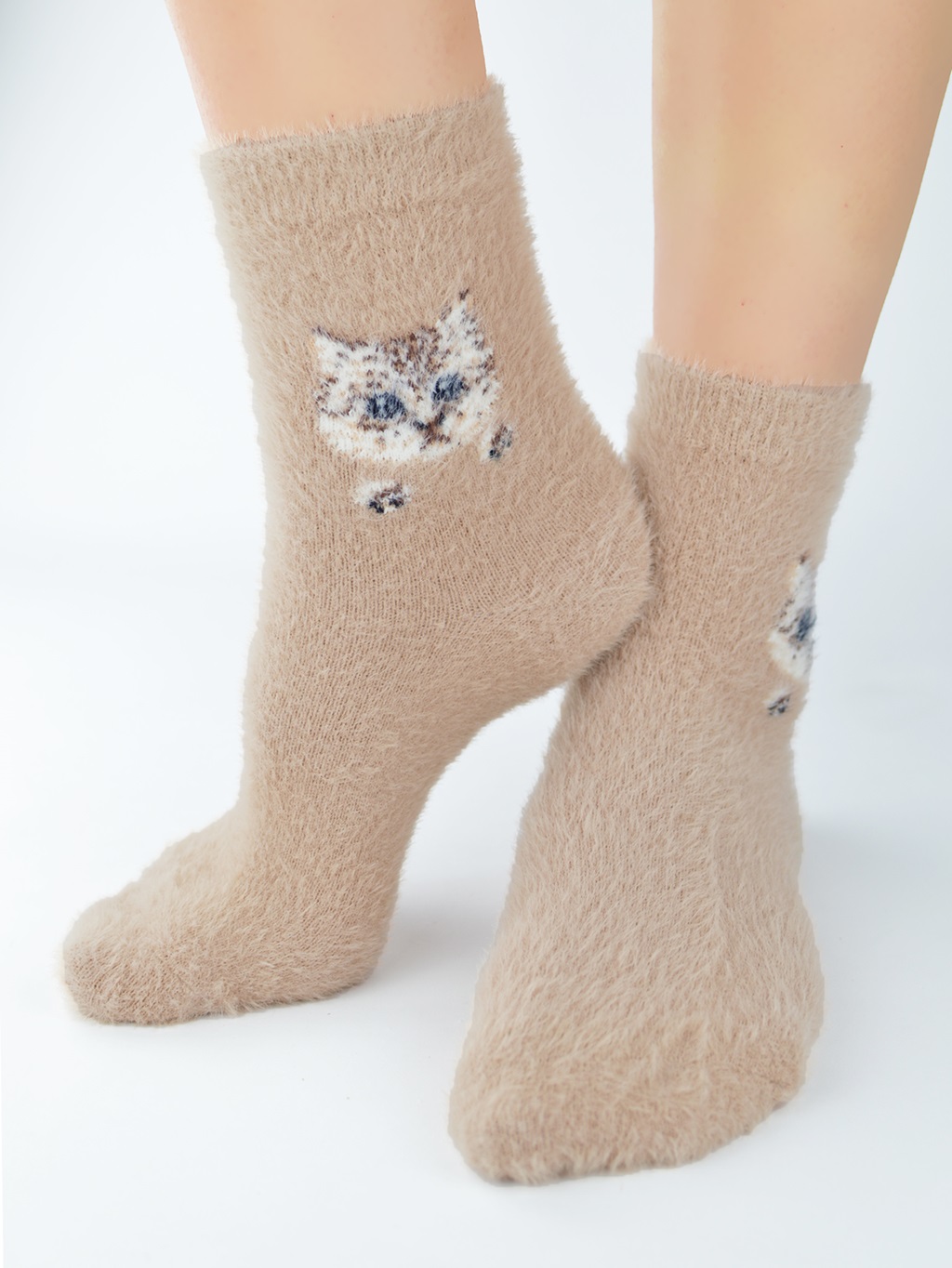 Жіночі пухнасті шкарпетки ідеально підійдуть для холодних осінніх і зимових днів. Виготовлені з пухнастого м'якого матеріалу, вони забезпечують тепло і комфорт при носінні. Прикрашена візерунком котика. Склад: 95% поліамід, 5% еластан.