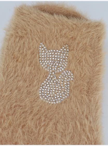 Жіночі шкарпетки з м'якої пухнастої тканини, прикрашені блискучою аплікацією з циркону у формі котик..